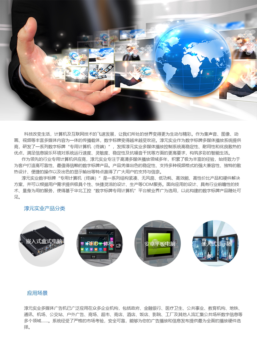 淳元實(shí)業(yè)多媒體廣告機(jī)已廣泛應(yīng)用在眾多企業(yè)機(jī)構(gòu),包括政府、金融銀行、醫(yī)療衛(wèi)生、公共事業(yè)、教育機(jī)構(gòu)、地鐵、通訊、機(jī)場、公交站、戶外廣告、商場、超市、商店、酒店、飯店、影院、工廠及其他人流匯集公共場所數(shù)字信息等多個(gè)領(lǐng)域……。系統(tǒng)經(jīng)受了嚴(yán)格的市場考驗(yàn),安全可靠,能夠?yàn)槟膹V告播放和信息發(fā)布提供最為全面的播放硬件選擇。